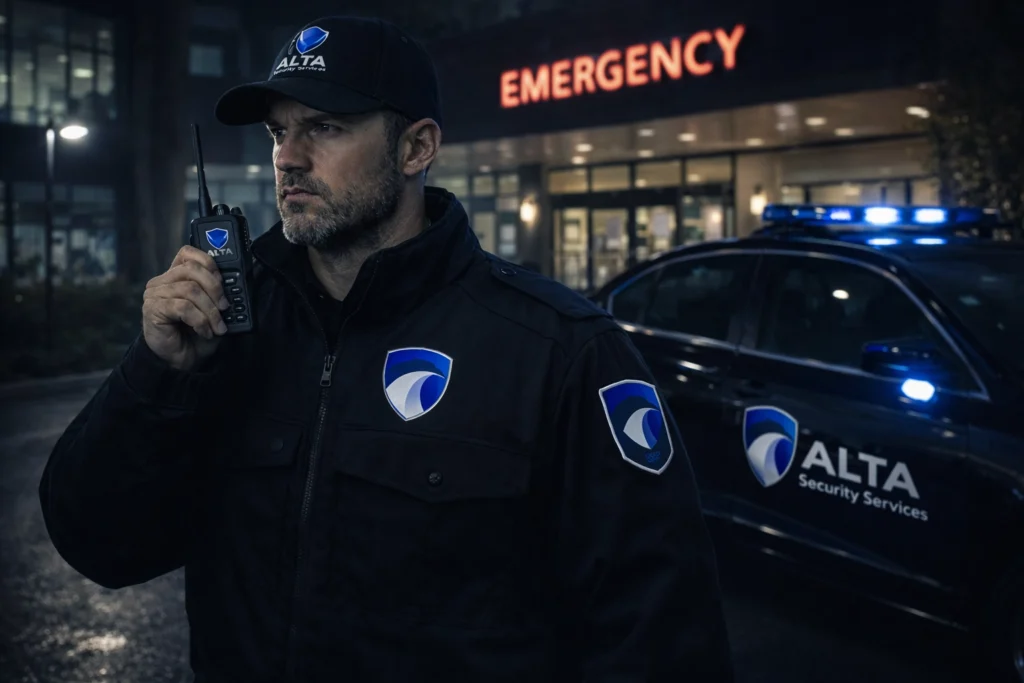 A nurse walks toward the ER entrance at 2 AM. An agitated visitor refuses to leave after hours. A patient's